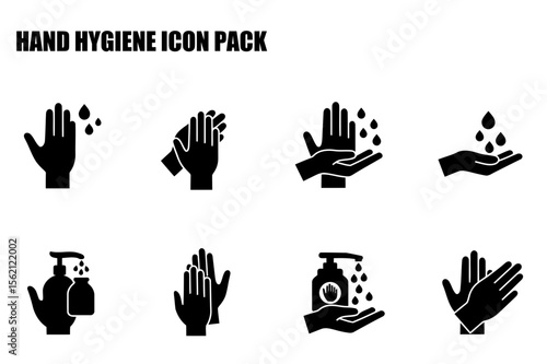 Hand hygiene icon pack showing various hand washing actions. Black and white graphic icons depicting hand washing steps in a public health infographic.