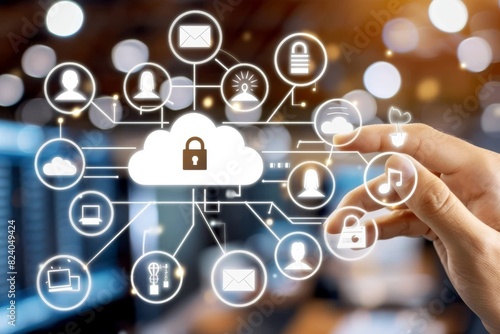 Hand interacting with a digital cloud lock interface, showcasing comprehensive data security and cloud technology in a vibrant, connected environment.