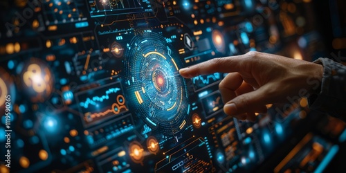 Hand interacting with a high-tech interface displaying complex data charts, glowing holographic elements