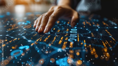 Hand interacting with data visualization on digital screen, showcasing futuristic technology and information analysis.