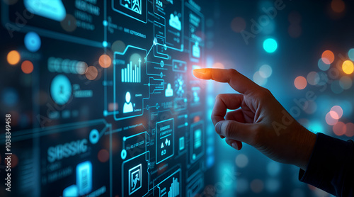 Hand Interacting with Futuristic Digital Interface Featuring Various Technology Icons and Data Elements Highlighting Cloud Computing and Connectivity