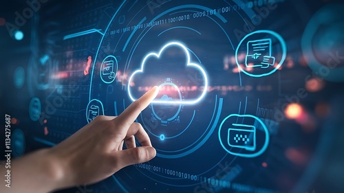 Hand Interacting with Glowing Cloud Technology Interface, cloud computing copy space, copy-space background, tech copyspace background