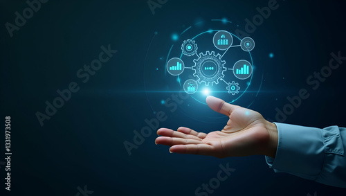 Hand interacting with holographic digital automation interface displaying gears data analysis optimization icons symbolizing business automation and process optimization in empty space concept as Hand