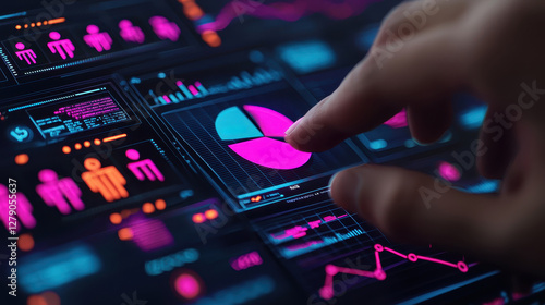 hand interacts with digital interface displaying colorful pie chart and data visualizations. modern design features abstract patterns and