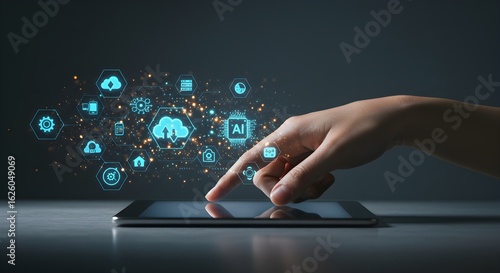 Hand interacts with digital tablet, accessing cloud computing and AI services.