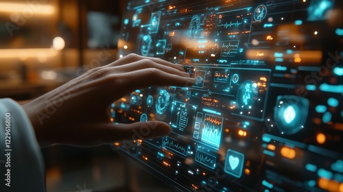 Hand interacts with futuristic medical interface