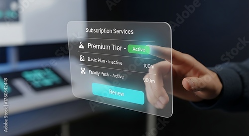 Hand interacts with transparent screen displaying subscription services in a modern office setting, highlighting premium tier activation with a futuristic and technological theme.