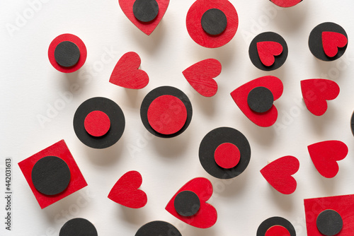 hand painted red hearts and black discs loosely arranged on a light background - photographed from above in ambient light - prominent shadows or three dimensionality