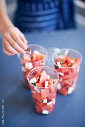 Hand preparing refreshing summer snacks