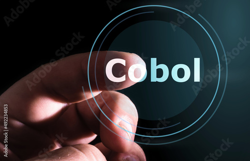 Hand pressing Cobol button on virtual screen. Cobol programming language.