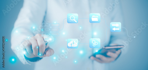 Hand pushing a button on a touch screen interface. Cloud computing, technology connectivity , working with a virtual screen computing diagram in business,ICT Information communication internet concept