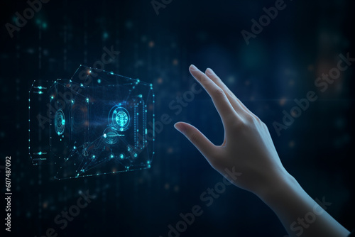 Hand reaching out to touch an interactive data screen, symbolizing the seamless connection between humans and technology. Ai generated