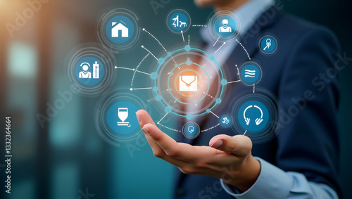 Hand Reviewing Holographic Business Audit Device: Compliance Data Analysis Icons in Empty Space