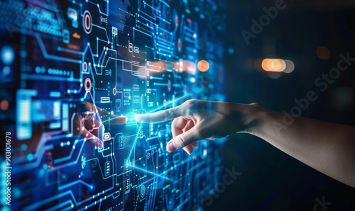 Hand touch on screen technology and innovation information data. Digital communication transformation concept, Generative AI