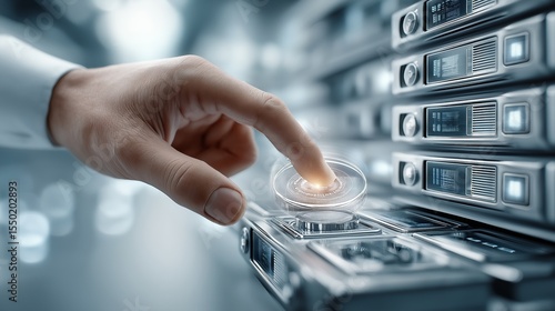 Hand Touching a Server Rack in a High-Tech Data Center, Representing Advanced Technology Management, Generative AI