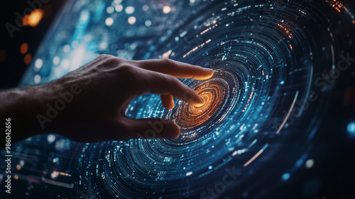 Hand touching a spinning data flow, data flow processing visualization background