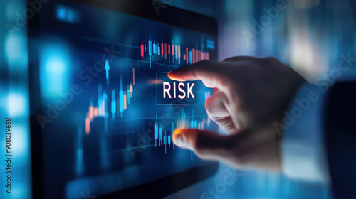 Hand Touching Risk Button on Digital Screen with Financial Data Graphs