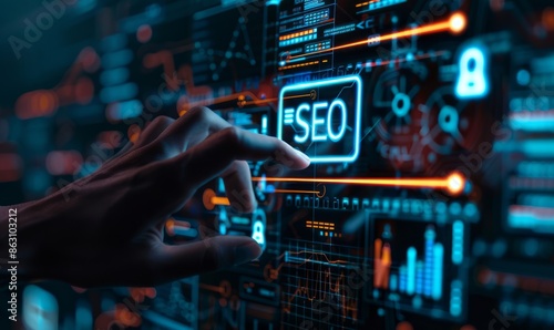 Hand touching SEO hologram interface with icons and data, depicting search engine optimization