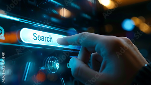 Hand touching virtual screen searching data for search engine Optimization or SEO, Internet connection online for find information, Using Search engine on website and web browser.