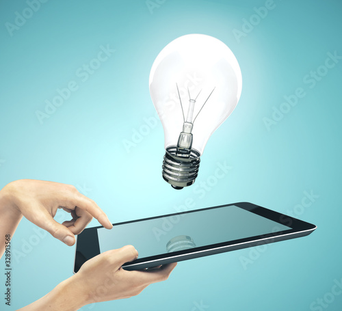 Hand using digital tablet with lightbulb.