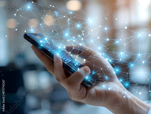Hand Using Smartphone with Digital Technology Data Communication Network on Abstract Background
