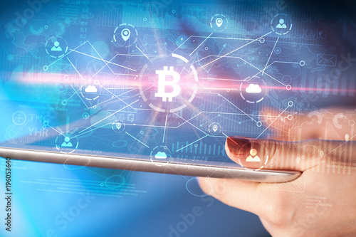 Hand using tablet with bitcoin link network and online concept