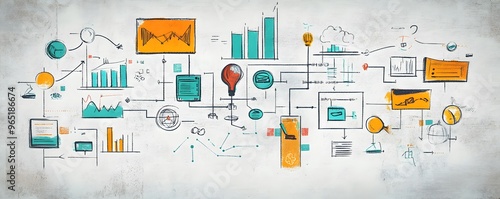 Hand-Drawn Diagram on a White Wall with Bright Colors and Geometric Shapes