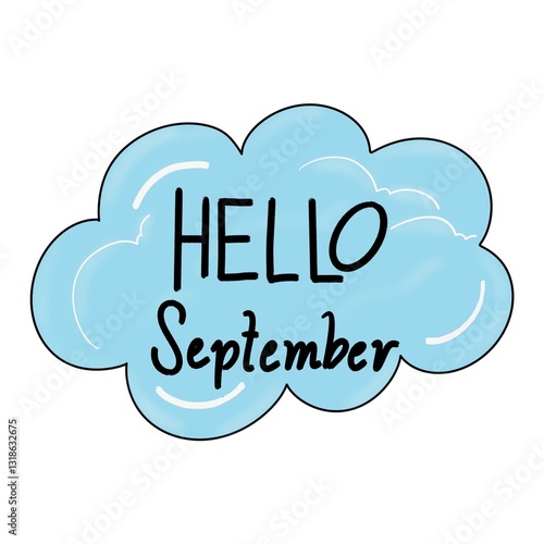Hand-drawn "Hello September" in cloud shape, typography digital art.