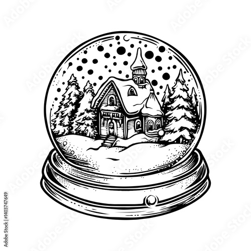 Hand-drawn snow globe with winter cabin and pine trees on white background.