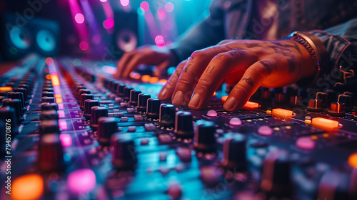Hands adjusting audio mixer.