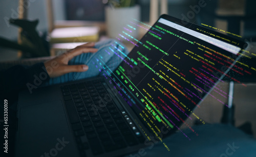 Hands, code overlay and laptop screen with cybersecurity, hacker and software data analysis. Person, programmer and computer work with firewall system hacking and algorithm writing for malware