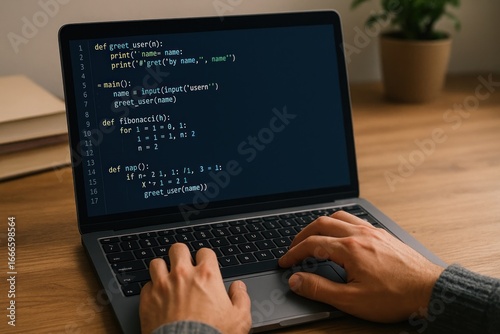 Hands coding on laptop screen.