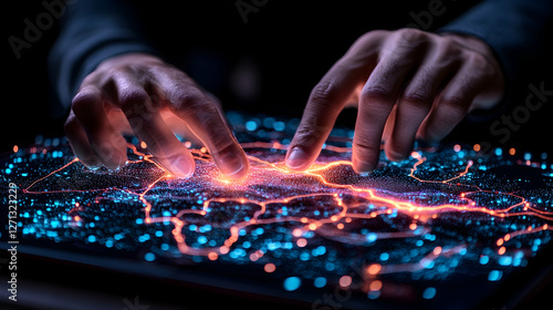 Hands interact with digital map, network data visualization, dark background, technology concept