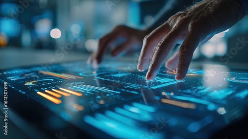 Hands Interact with High-Tech Interface Displaying Futuristic Data, Charts, and Information Graphics, Creating an Immersive User Experience