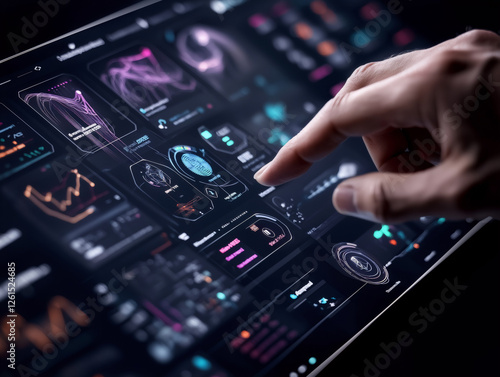 Hands interacting with futuristic data dashboards featuring holographic charts, digital graphs, and UI elements in a high-tech interface.