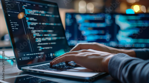 Hands meticulously coding on a laptop with multiple screens in the background displaying lines of code, capturing intense focus and programming dedication.