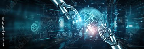 Hands of robots touching on telecommunications network connections highlight robotics enhancing connectivity. Robots optimize signal transmission, enable real-time data sharing, improve reliability.