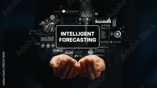 Hands Presenting Intelligent Forecasting Text with Digital Analytics and Graphs in Background. Asymptotic smart data analytic.