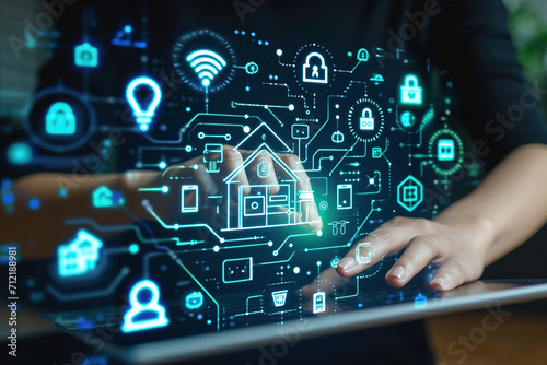 Hands programming or setting up smart home automation. Smart control panel display.