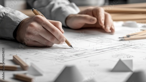 Hands sketching architectural plans with tools on a table