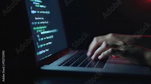 hands typing code on a laptop glowing screen dark room