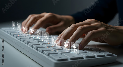 Hands typing on a computer keyboard in an office