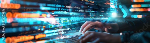 Hands typing on a keyboard with code and data streaming in the background, representing software development and programming concepts.