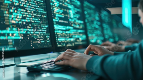 Hands typing on a keyboard with multiple screens displaying code, illustrating programming and software development.