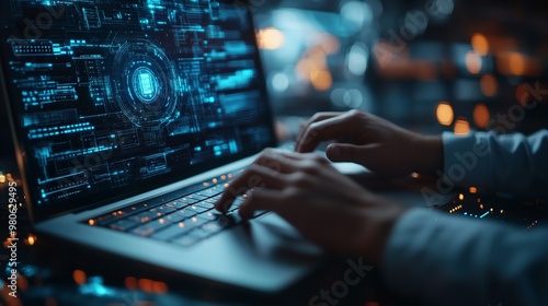 Hands typing on a laptop with code overlay, representing data science, programming, and machine learning