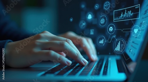 Hands typing on keyboard, holograms of graphs above screen, futuristic tech vibe, cool blue light.
