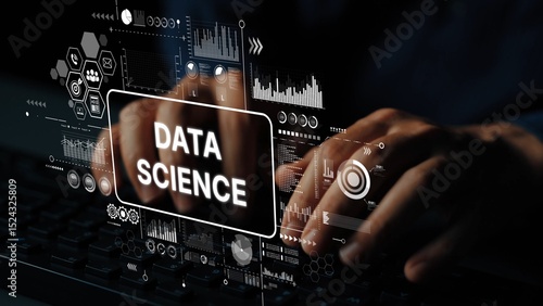 Hands Typing on Keyboard with Data Science Graphics Overlay in Dark Environment. Asymptotic smart data analytic.
