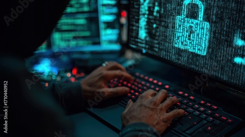 Hands Typing on Keyboard with Digital Lock Screen Displaying Binary Code for Cybersecurity