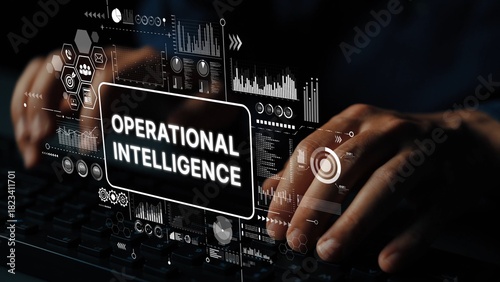 Hands Typing on Keyboard with Operational Intelligence Graphics and Data Visualizations in a Modern Digital Environment. Asymptotic smart data analytic.