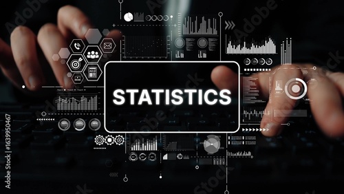 Hands Typing on Keyboard with Overlay of Statistical Data Visualizations and Graphs Showing Analysis and Metrics. Asymptotic smart data analytic.